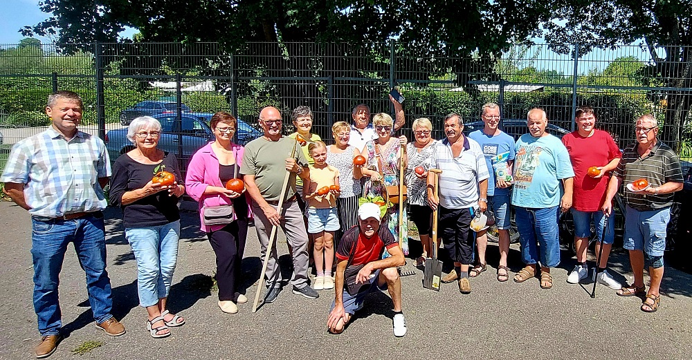 Gruppenbild mit Hobbygärtnern, die in ihren Händen übergroße Tomaten halten