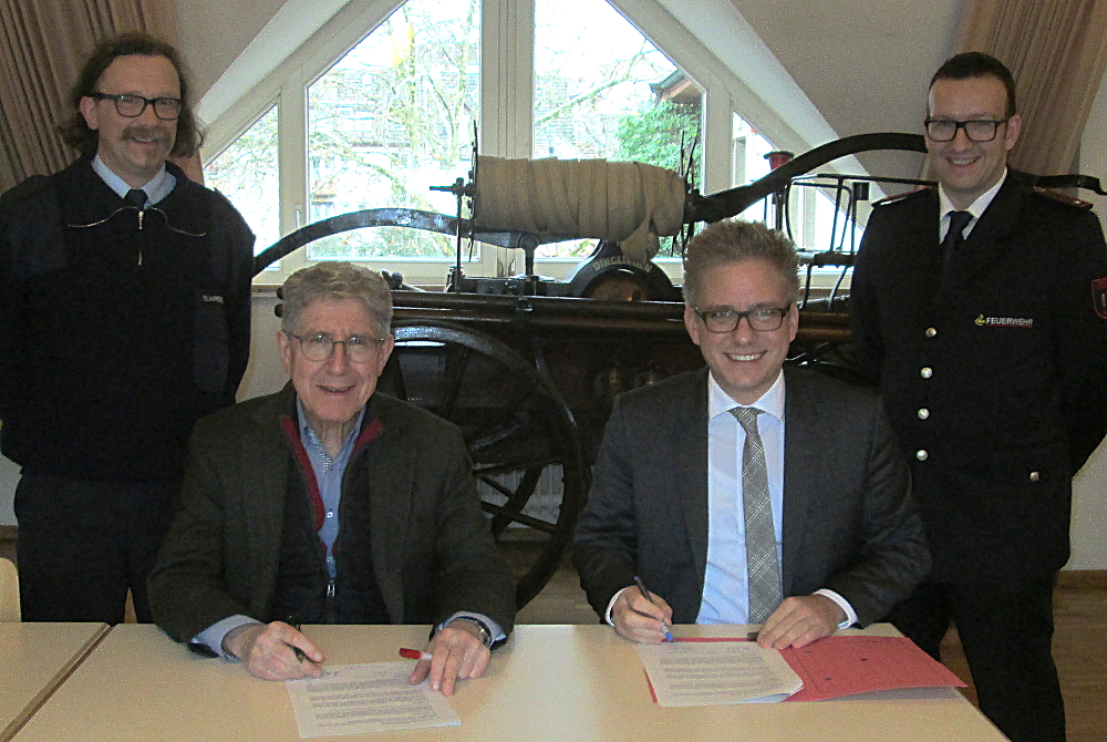 Rusts Bürgermeister Kai-Achim Klare und Lahrs Oberbürgermeister Dr. Wolfgang G. Müller haben am Freitag, 08. Dezember 2017, die Verträge unterzeichnet, mit denen sich die Feuerwehr der Gemeinde Rust ab Anfang 2018 am Schlauchpool der Feuerwehr Stadt Lahr beteiligt.
