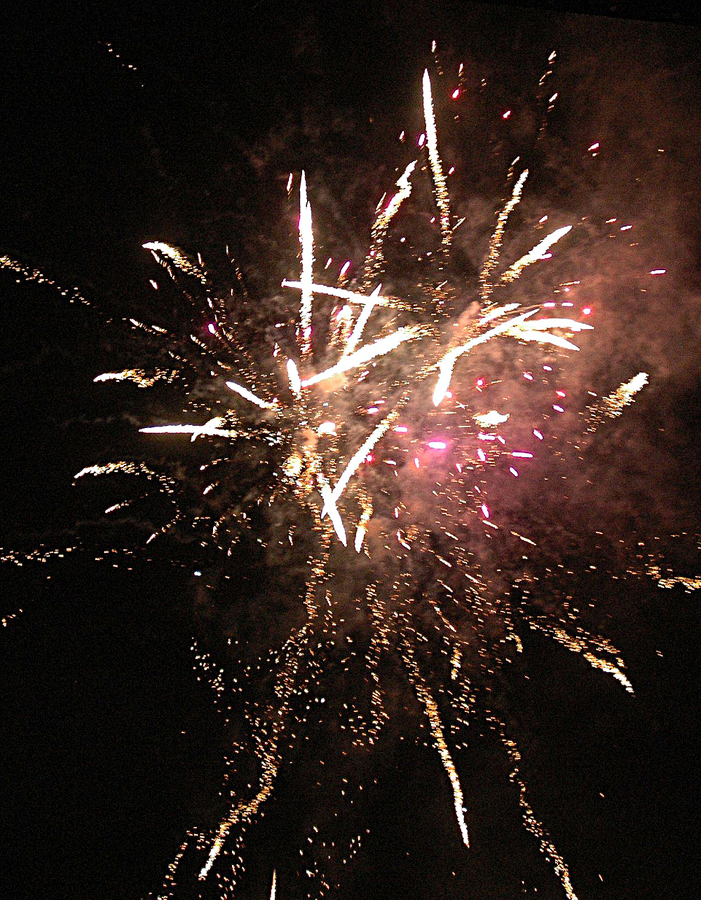 Feuerwerk in der Stadt Lahr mit explodierenden weißen Raketen im dunklen Nachthimmel.