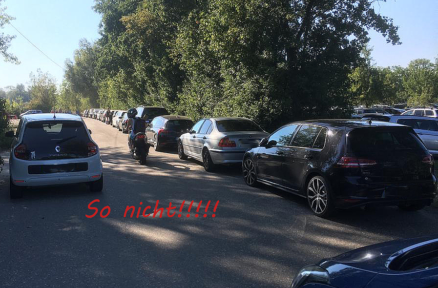 Das Bild zeigt die Zufahrt zum Waldmattensee. An beiden Seiten stehen Fahrzeuge, die den Rettungsweg versperren.