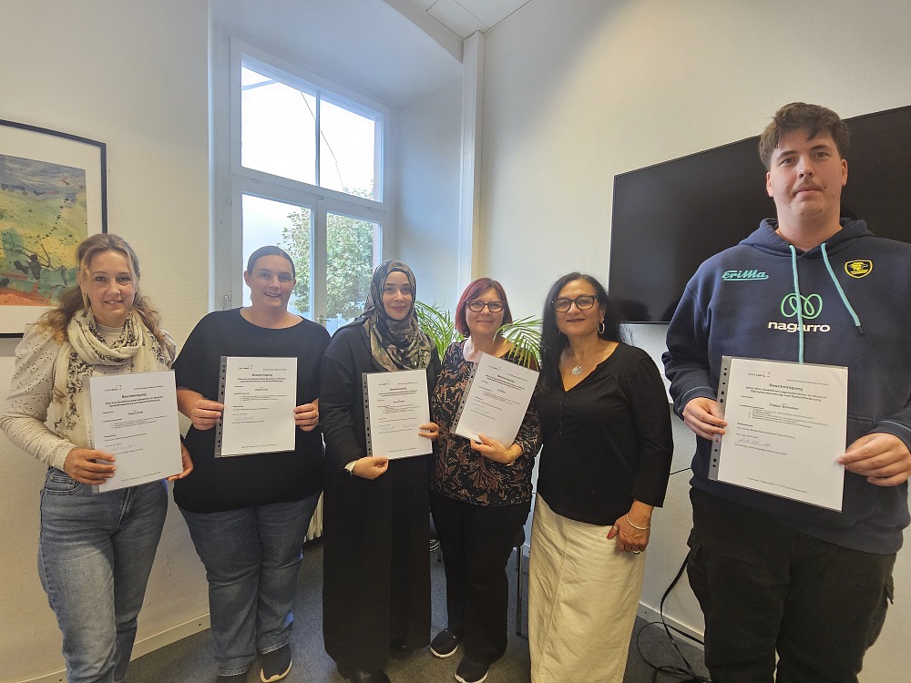 Fachberaterin Asli Schulte (Fünfte von links) gratuliert Tanja Lemke, Kerstin Tritz, Esma Kamber, Irina Wick (von links) und Fabian Schreiber (rechts) zum erfolgreichen Abschluss der Weiterqualifizierung.