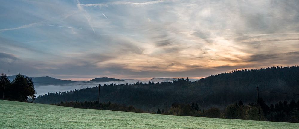 Blick vom Langenhard in Richtung Vogesen. Sulz liegt im Nebel verdeckt.