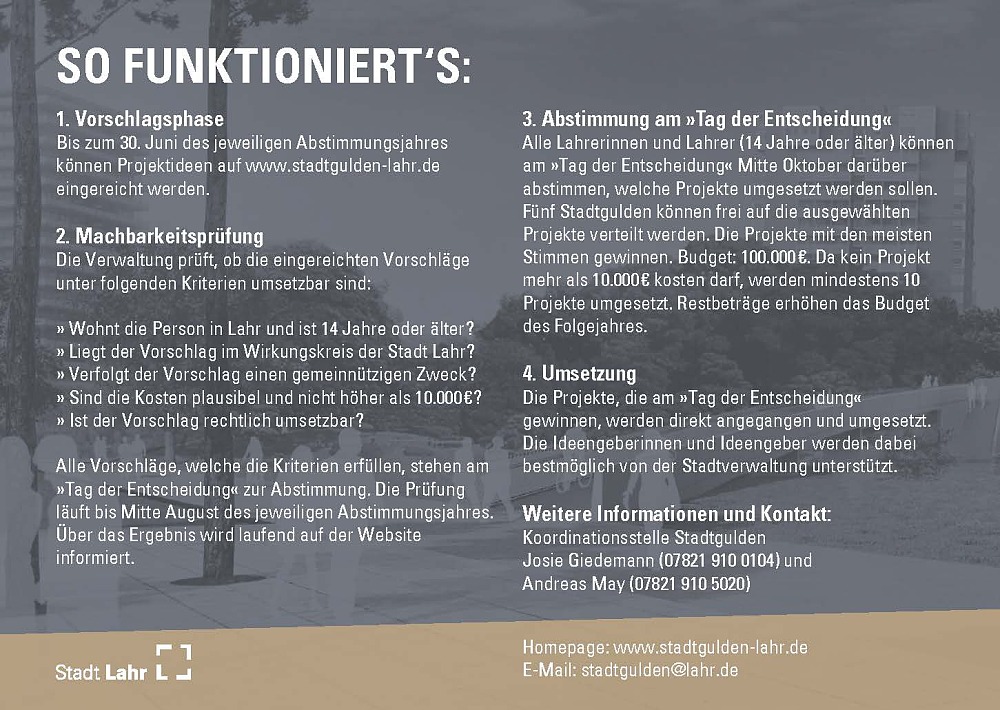 Alle weiteren Informationen erhalten Sie auf der Stadtgulden-Website. Dort können Sie Projektvorschläge einbringen und und sich zur Online-Abstimmung registrieren.