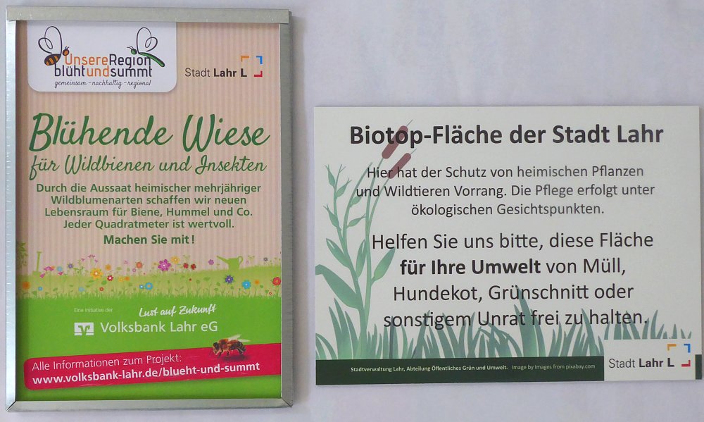 Zunächst werden an 24 Stellen eigens entwickelte Biotop-Schilder angebracht, die auf extensiv gemähte Naturschutzflächen der Stadt Lahr hinweisen. Sie enthalten außerdem die Bitte, die Flächen von Müll, Hundekot, Grünschnitt und anderem Unrat freizuhalten.