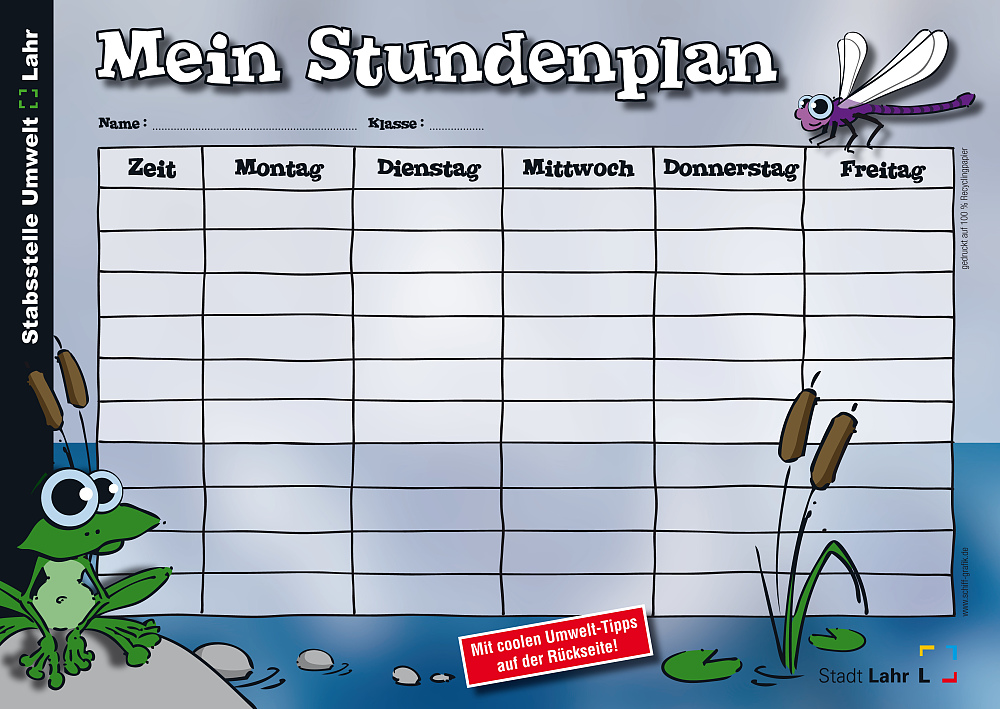Zum Beginn des neuen Schuljahrs erhalten die Schülerinnen und Schüler der Lahrer Grundschulen wieder einen Stundenplan von der Stadt Lahr. Ansprechend gestaltet, befinden sich auf der Vorderseite der Stundenplan und auf der Rückseite praktische Tipps für den umweltfreundlichen Schulalltag.