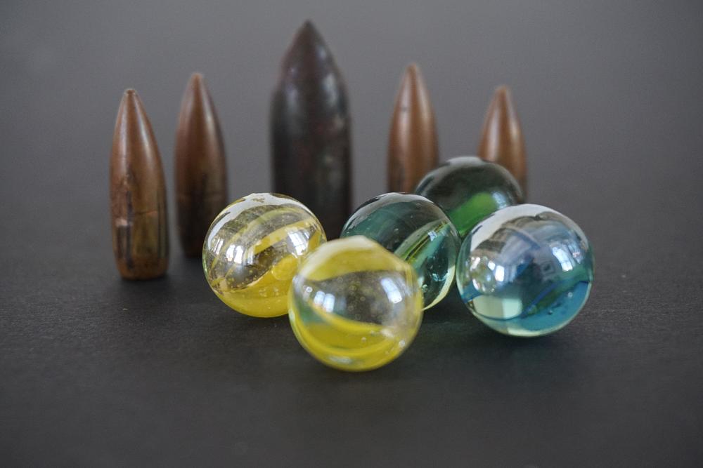 „Der Schlüssel gehörte zu meiner Eigentumswohnung in Aleppo. Das Haus war Teil eines größeren Wohnprojekts und hatte vier Stockwerke. Im Obersten wohnte ich mit meiner Familie. Im Haus lebten noch weitere neun Familien. Bevor wir einziehen konnten, haben wir sieben Jahre lang den Kaufpreis in Raten abbezahlt. Es war eine schöne Wohnung. Es gibt nur noch ein einziges Foto, das ich von der Wohnung habe. Es zeigt meine damals siebenjährige Tochter Rosel im Wohnzimmer. Sie zeigt stolz, dass sie sich – wie ich – ein Tuch um den Kopf gebunden hat, weil wir gleich in die Küche gehen wollten und unsere Haare den Essengeruch nicht annehmen sollten. Die anderen Fotos auf dem Handy sind auf der Flucht zerstört worden. Nach Zahlung der letzten Rate und dem Einzug konnten wir nur eineinhalb Jahre in der Wohnung leben, bis der Krieg und die Zerstörung Aleppos begannen. Nachdem der Rest unserer Familie nach Afrin gezogen war, lebten die beiden Kinder und ich von 2011 bis 2012 in der umkämpften Stadt, weil wir nicht durch die Kriegsparteien hindurch zu unserer Familie gehen konnten. Es war ein Jahr ohne Elektrizität, und bald auch ohne Fenster, die durch die Bombenexplosionen zerborsten waren. Nur ein Mann lebte ebenfalls noch im Haus. Schließlich konnten wir ins Haus meines Vaters ziehen und erfuhren dort, dass unser Haus einen Tag später durch eine Bombe zerstört worden war. Als wir das Haus meines Vaters verließen, nahm ich die Schlüssel meiner Wohnung mit – in der Hoffnung, wiederzurückkehren zu können. Das Band am Schlüsselring hat übrigens die Farben Kurdistans.Die Patronen fand Siamand auf dem Dach des Hauses seines Großvaters, einige steckten auch im Mauerwerk. Er hat sie in einer kleinen Tasche mitgenommen – als Erinnerung an den Krieg in unserem Heimatland und in unserer Stadt. Und noch etwas ganz Gegensätzliches nahm er mit: Murmeln, mit denen er zusammen mit seinen Freunden spielte. Er hat in Deutschland noch keine Kinder mit Murmeln spielen gesehen.“