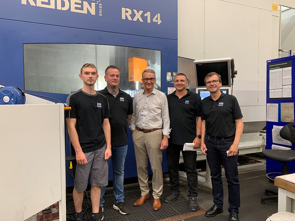 Oberbürgermeister Markus Ibert (Dritter von links) mit Kevin Klassen, Zerspanungsmechaniker, Dominik Kleinsorgen, Leiter CAD/CAM-Programmierung, Alexander Strecker, Teamleiter Freiformfräsen, und Ingo Kluge, Geschäftsführer der WELTER zahnrad GmbH.