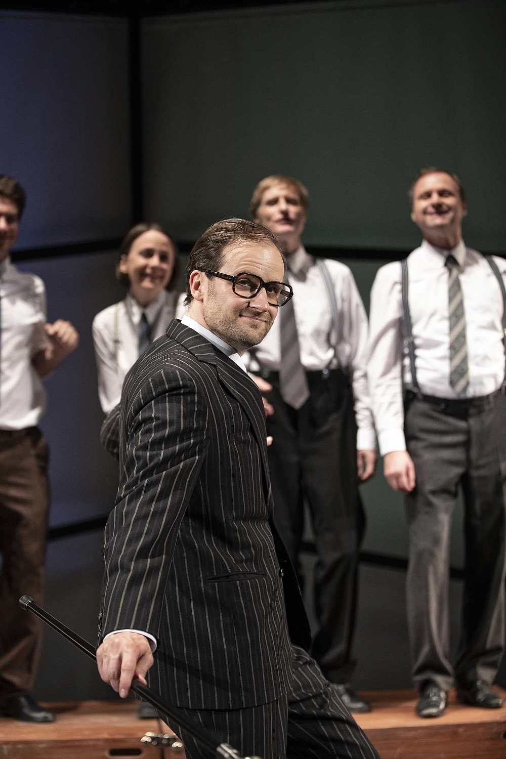 Ein Mann mit schwarzem Nadelstreifen-Anzug, dunklen zurück-gekämmten Haaren und einem schwarz glänzendem Gehstock lächelt süffisant in die Kamera. Im Hintergrund stehen mehrere lächelnde Personen mit schwarzen Hosen, Hosenträgern und weißen Hemden.