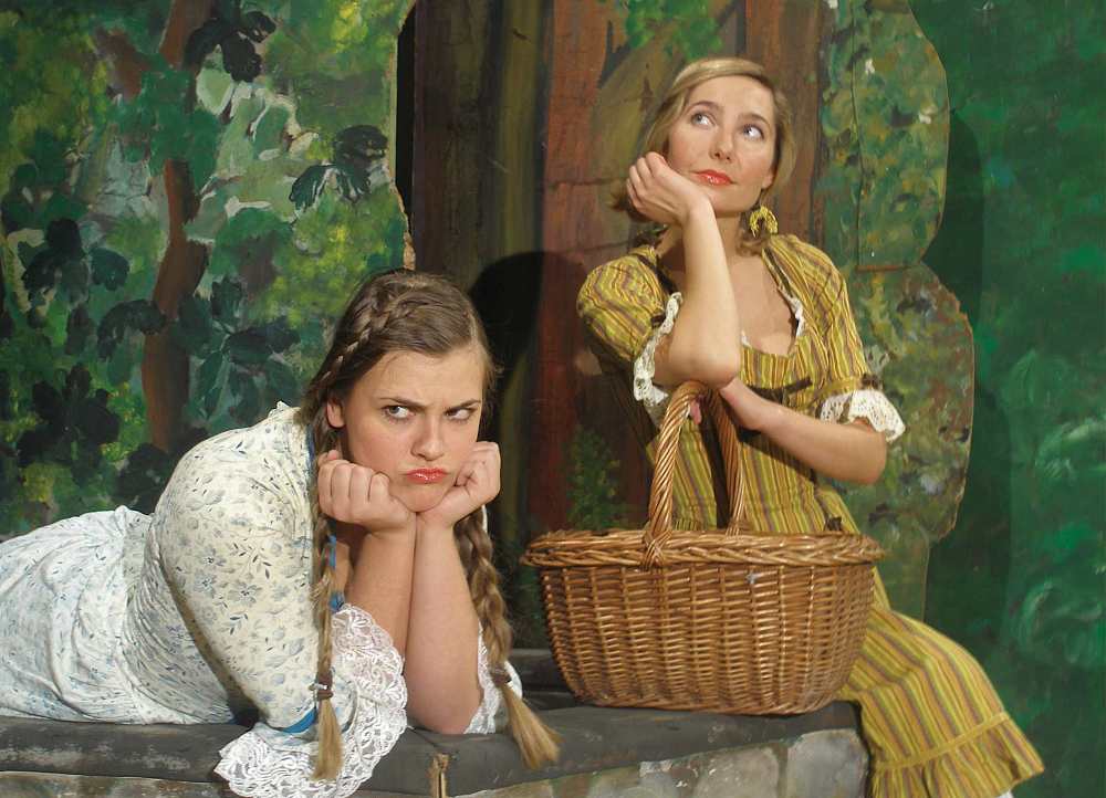 Die Glücksmarie, im goldenen Kleid und einem Korb in der Hand wirkt nachdenklich. Die Pechmarie zieht eine Schnute und stützt sich mit beiden Ellenbogen auf dem Brunnenrand ab.